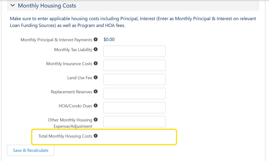 You should have already entered the Monthly Principal and Interest costs for any loans on the respective Funding Source, and Monthly Principal and Interest will be auto-filled here. These amounts add up to Total Monthly Housing Costs.