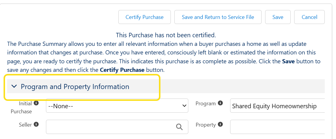 - Seller: Seller should only be filled out if the Seller is another low income owner (eg. another buyer in your Program). The Seller field connects this Service File to the household who sold the home's Service File.