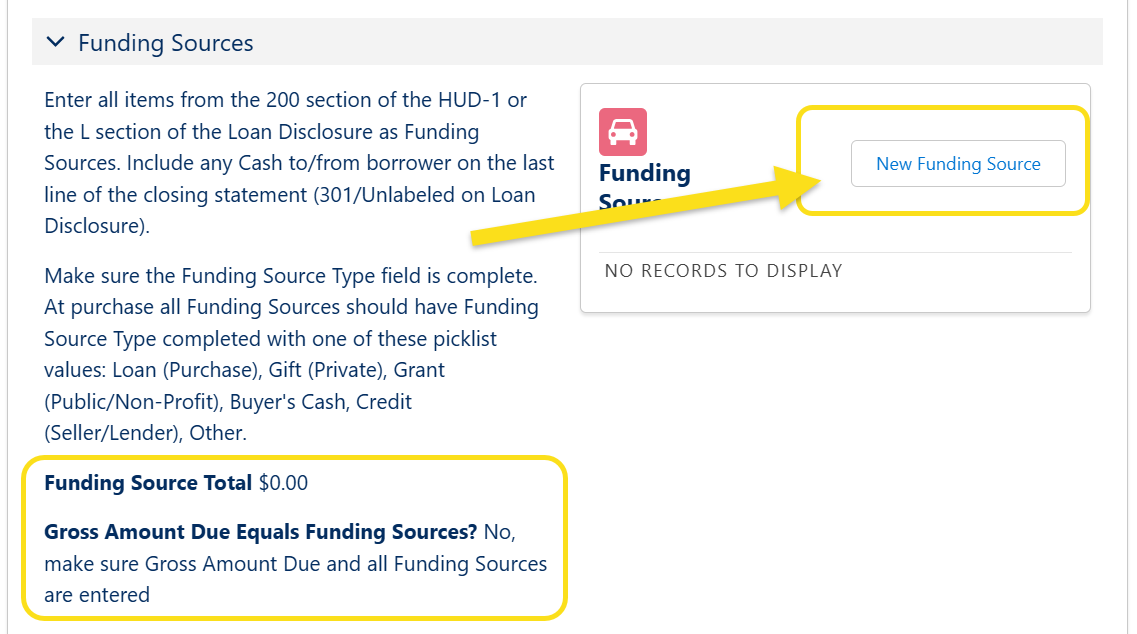 The funding sources should reflect all amounts paid by or on behalf of the buyer itemzed in section L of the Closing Disclosure (200 of the HUD-1) and any amount in last line of the Closing Disclosure (Line 303 of the HUD-1). These will also include adjustments and credits paid to the buyer, for things like credits from the seller or the lender for taxes or other items. It can be useful to include the line of the Closing Disclosure or HUD in the Name of the Funding Source as you are reconciling. Funding Sources are important to enter correctly in order for accurate Community Investment and Return on Investment Calculations.