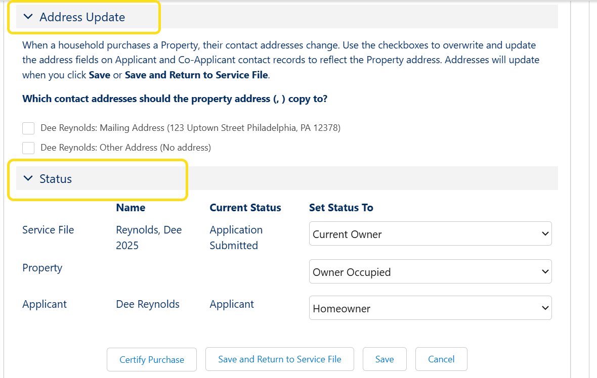 - Update the status of the Service File to Current Owner. Note that Status field never changes automatically, though it does trigger updates on the Property and Contact records.