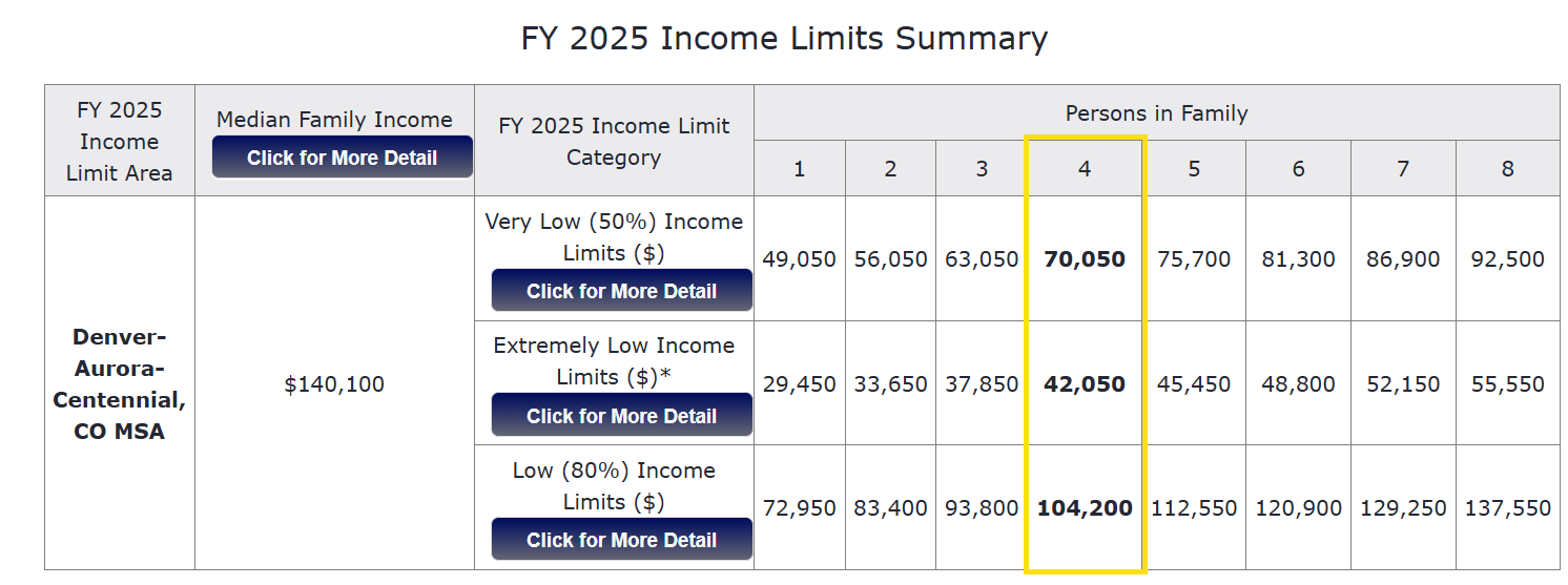 80% Income Limits: $104,200 / 0.8 = $130,250