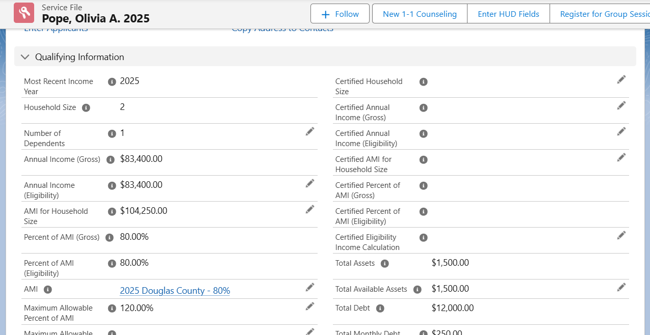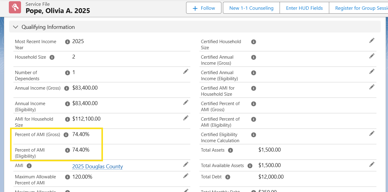 You should now see it calculating the Percent of AMI (Gross) and Percent of AMI (Eligibility) based on the Income Limits, and $90,000 for a family of four is 80% for your reporting purposes.